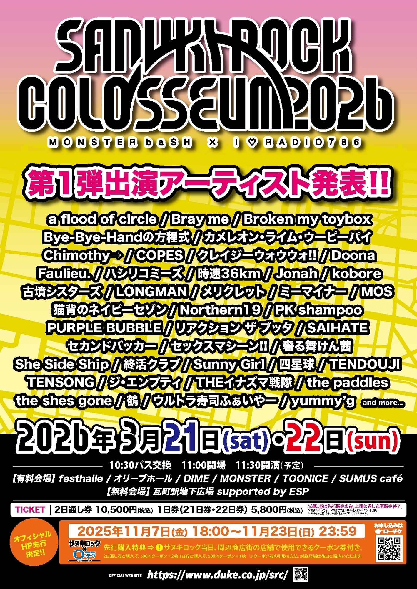 3月21-22日(土-日) SANUKI ROCK COLOSSEUM 2026 -MONSTER baSH × I♡RADIO 786- の出演が決定しました。