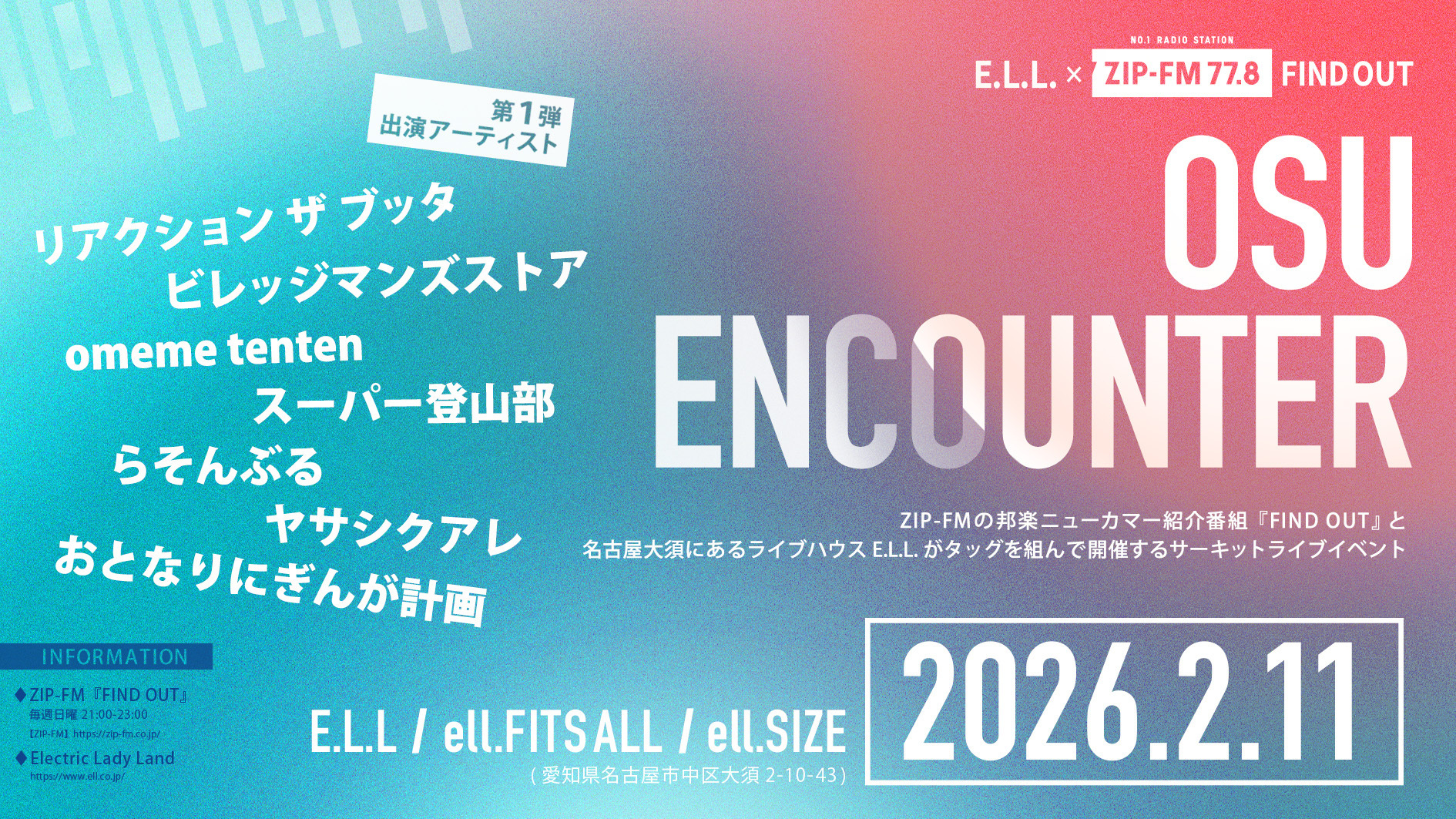 2月11日(水・祝) E.L.L. × ZIP-FM FIND OUT OSU ENCOUNTER 2026の出演が決定しました。
